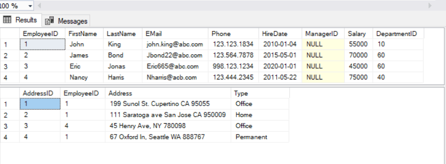The Employee and Address tables are linked by the key column EmployeeID. It is a foreign key in the Address table linking to the primary key EmployeeID in the Employee table. Thus, one record of the Employee table can point to multiple records in the Address table. This is a One-to-Many relationship.