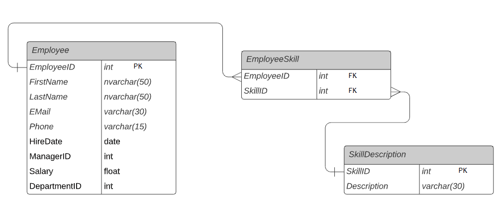 In the example above, the EmployeeSkill is the junction table that contains EmployeeID and SkillID foreign key columns to form many-to-many relation between the Employee and SkillDescription table. Individually, the Employee and EmployeeSkill have a one-to-many relation and the SkillDescription and EmployeeSkill tables have one-to-many relation. But, they form many-to-many relation by using a junction table EmployeeSkill.