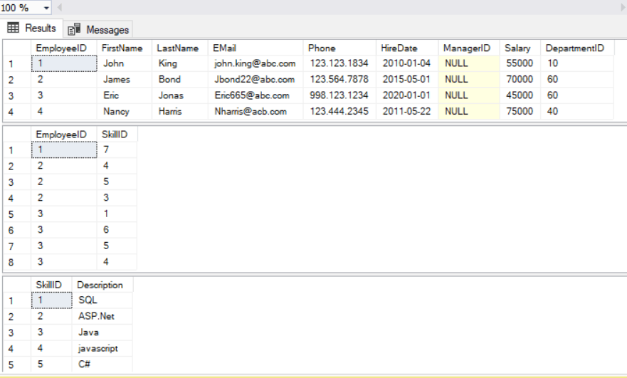 SELECT * FROM EmployeeSELECT * FROM EmployeeSkillSELECT * FROM SkillDescription