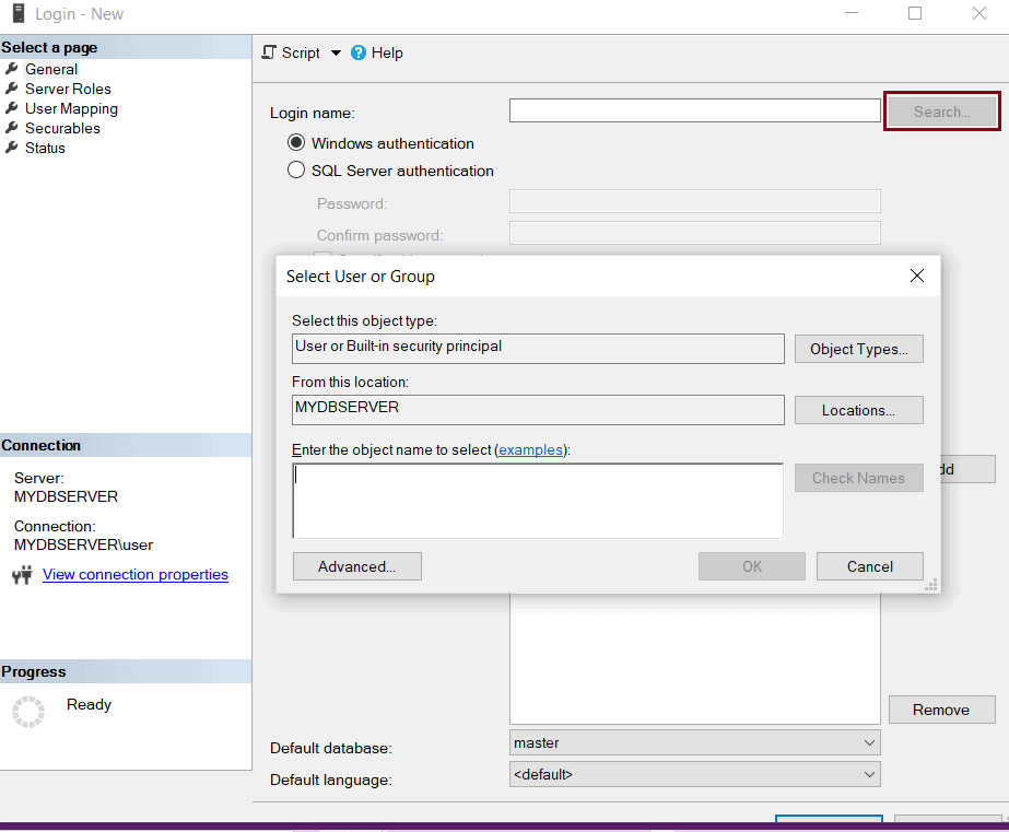 Create New Login In the Login –New window, shown below, enter a Windows user name. If a user name is not a Windows user then it will raise an error. You may click on the Search button to search a Windows user, as shown below.