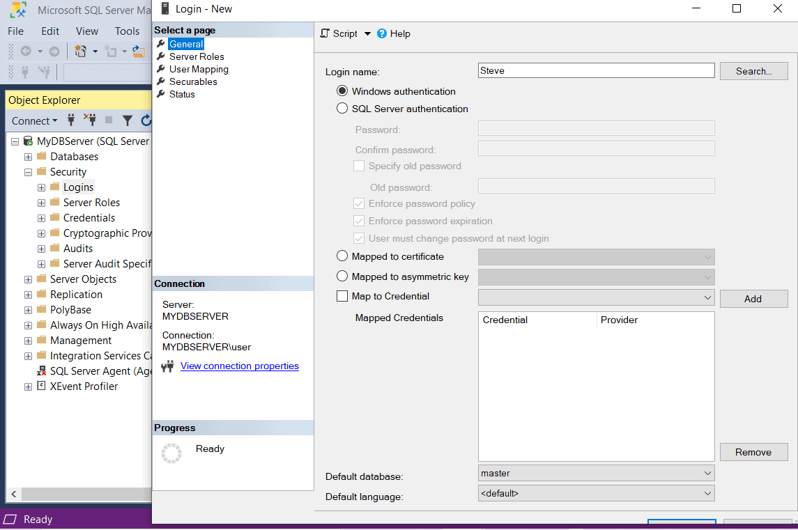 Server Roles Click the User mapping tab. Here, we will map our Windows login to a database user.