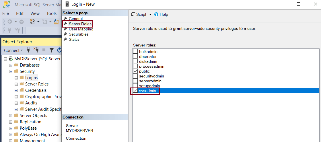 Create New Login Now, to assign roles & permission to the new login, go to the Server Roles tab. On the Server Roles page, you can assign the server-level role to the new login by clicking the checkbox next to the role. By default, the public role is assigned to a new login. Additionally, let us assign the sysadmin role by clicking on the checkbox next to sysadmin. With sysadmin server role, user can perform any activity on the server and has full control.